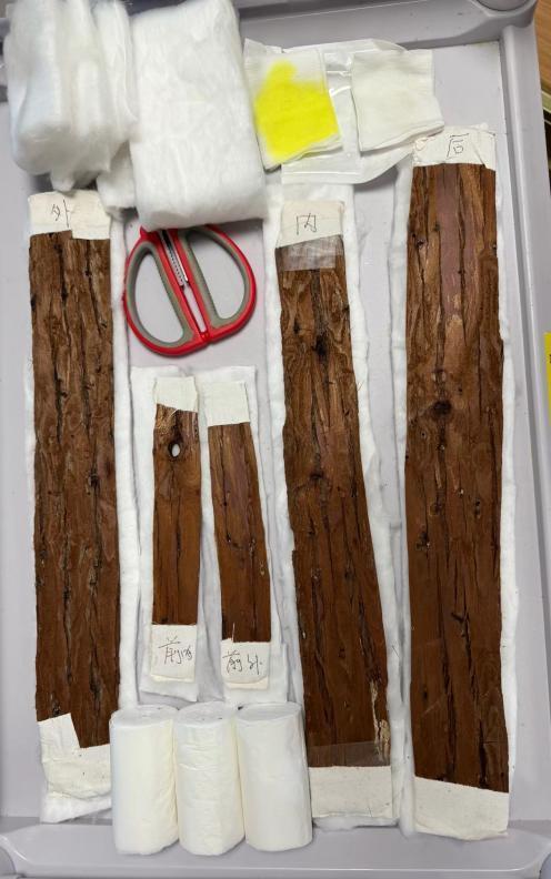 在中医传统特色疗法的夹板固定治疗法中,不同地区会结合地域特征就地取材,很多材质都可以被制作成小夹板。陈凯奇介绍,杉树皮小夹板的固定大多用于四肢骨折和创伤脱臼,在经过手法正骨之后维持骨折端,或是脱臼之后维持关节的稳定性,在岭南地区有着深厚的历史底蕴,岭南地区水杉树资源丰富,其材质厚实,在明清时代就已被广泛使用,逐渐在岭南伤科正骨外固定领域沿用下来。